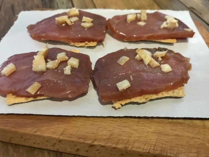Una vitrina con muchísimos quesos, que puedes acompañar con un buen vino de Jerez. Además no te pierdas el atún que sobre una confitura de alcachofa de Cantizano, rompe maravillosamente el salado.