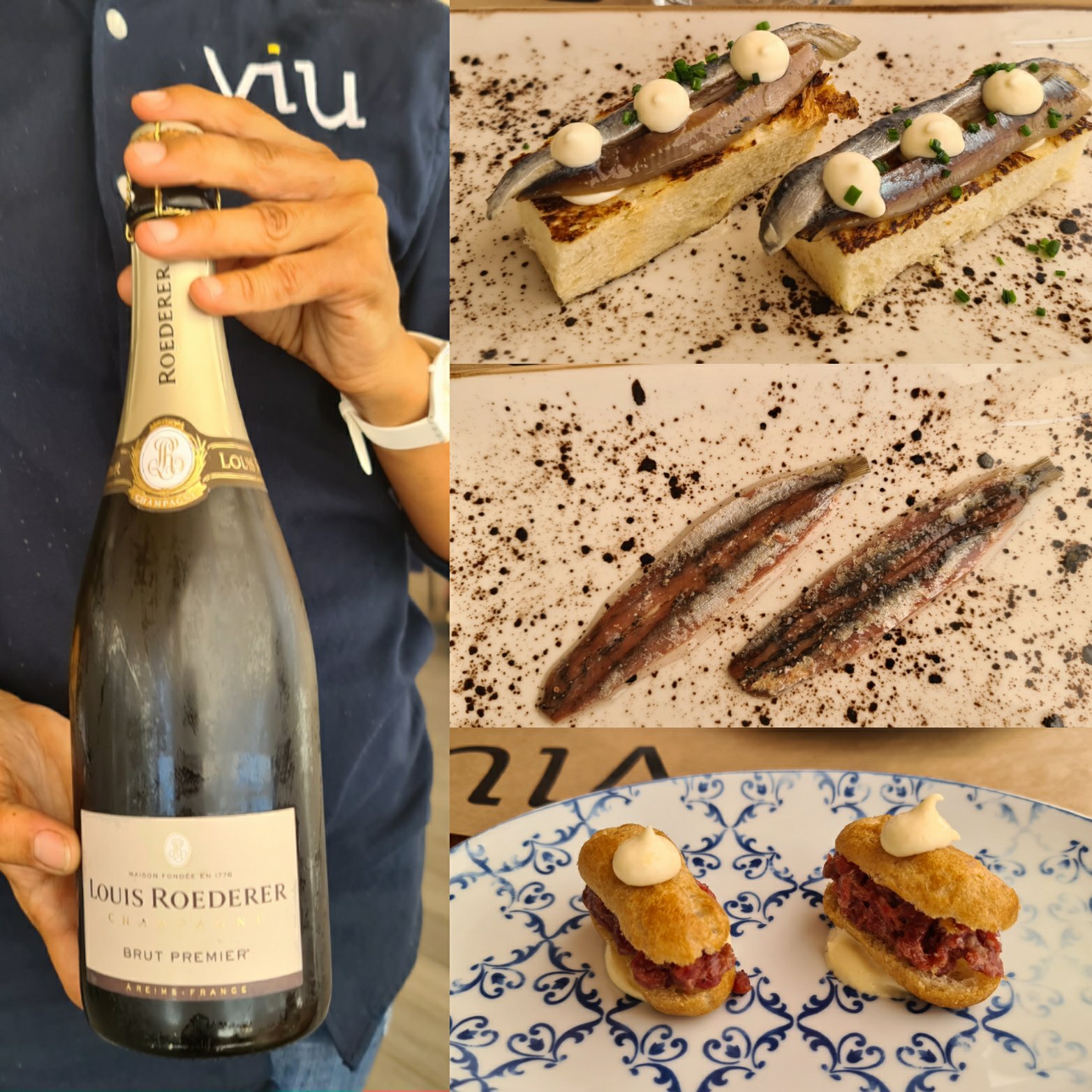 Un primer sorbo de champagne 🍾@louisroederer_ te va preparando para degustar el punto salino del mar, con un «matrimonio» con una base de brioche bien tierno y unas anchoas Solano Arriola de Santoña excelentes.