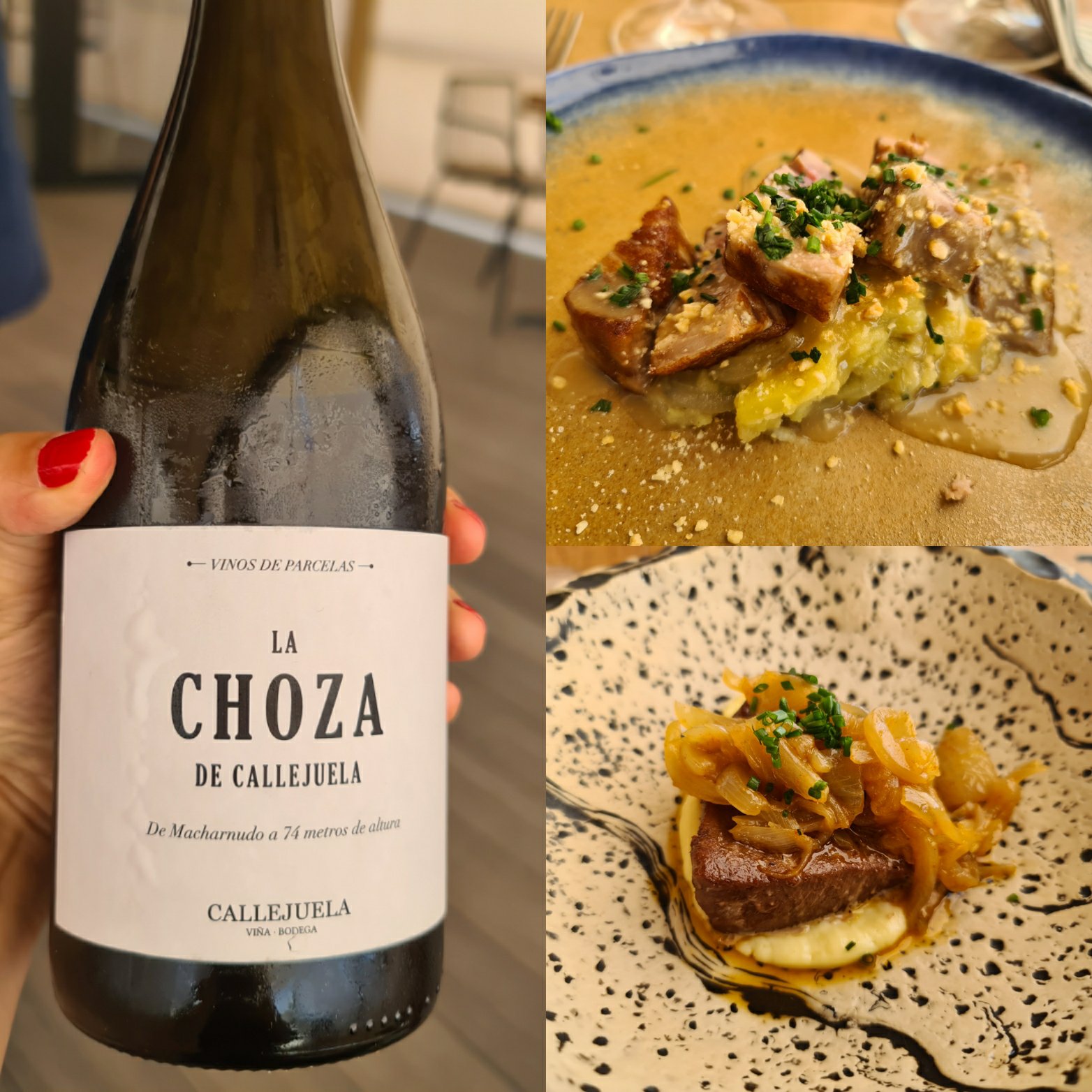 Seguimos con un par de guisos tb de atún con base de nuestra patata sanluqueña: solomillo de atun al whisky y mormo al horno con cebolla al estilo barbate, maridados con La Choza de Callejuela, vino que encontré muy especial.