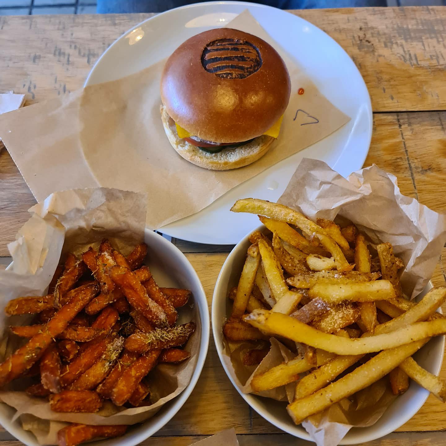 Por supuesto quise probar la hamburguesa Little John, a destacar la frescura y ternura del pan tipo bollo 👌 sin grandes pretensiones, carne jugosa, bien condimentada y muy rica. Acompañamiento de patatas y de boniato aderezado de romero q le da un punto diferente 🥰