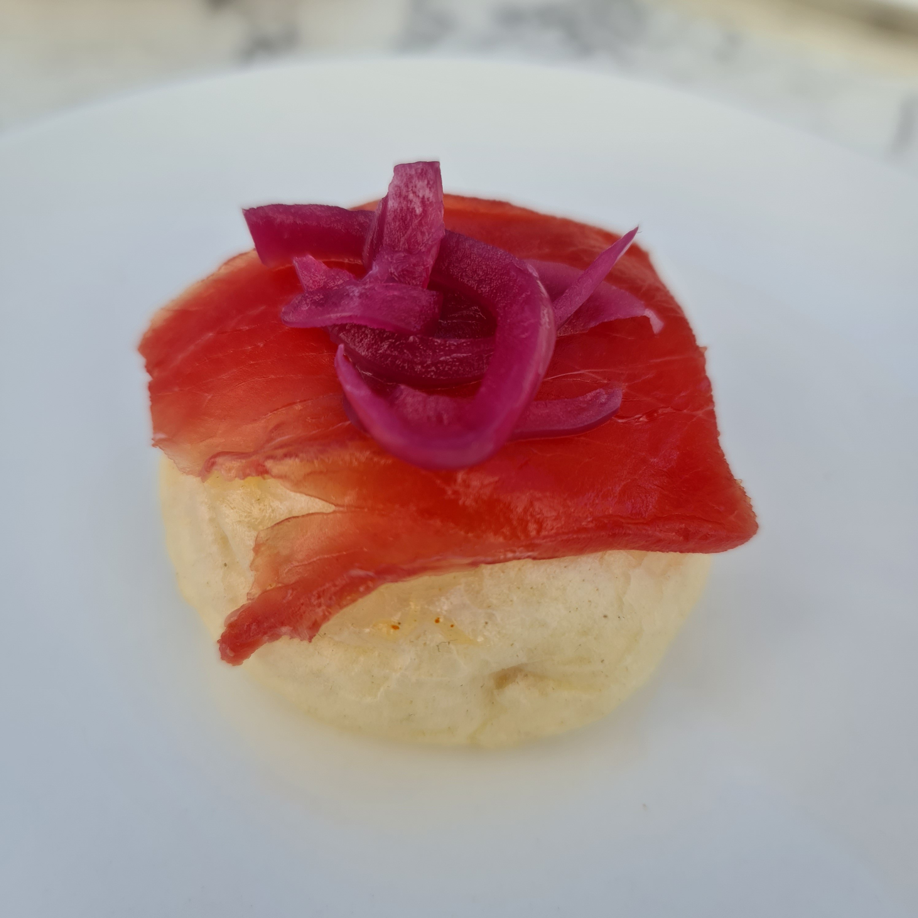 En cuanto a la comida, sus famosos molletes de atún, q como decía mi amigo, tienen un toque de pan bao gaditano: están rellenos de salsa kimchi con mayonesa, una loncha de atún en lo alto y rizos de cebolla encurtida. Para comer de un bocado 🥰