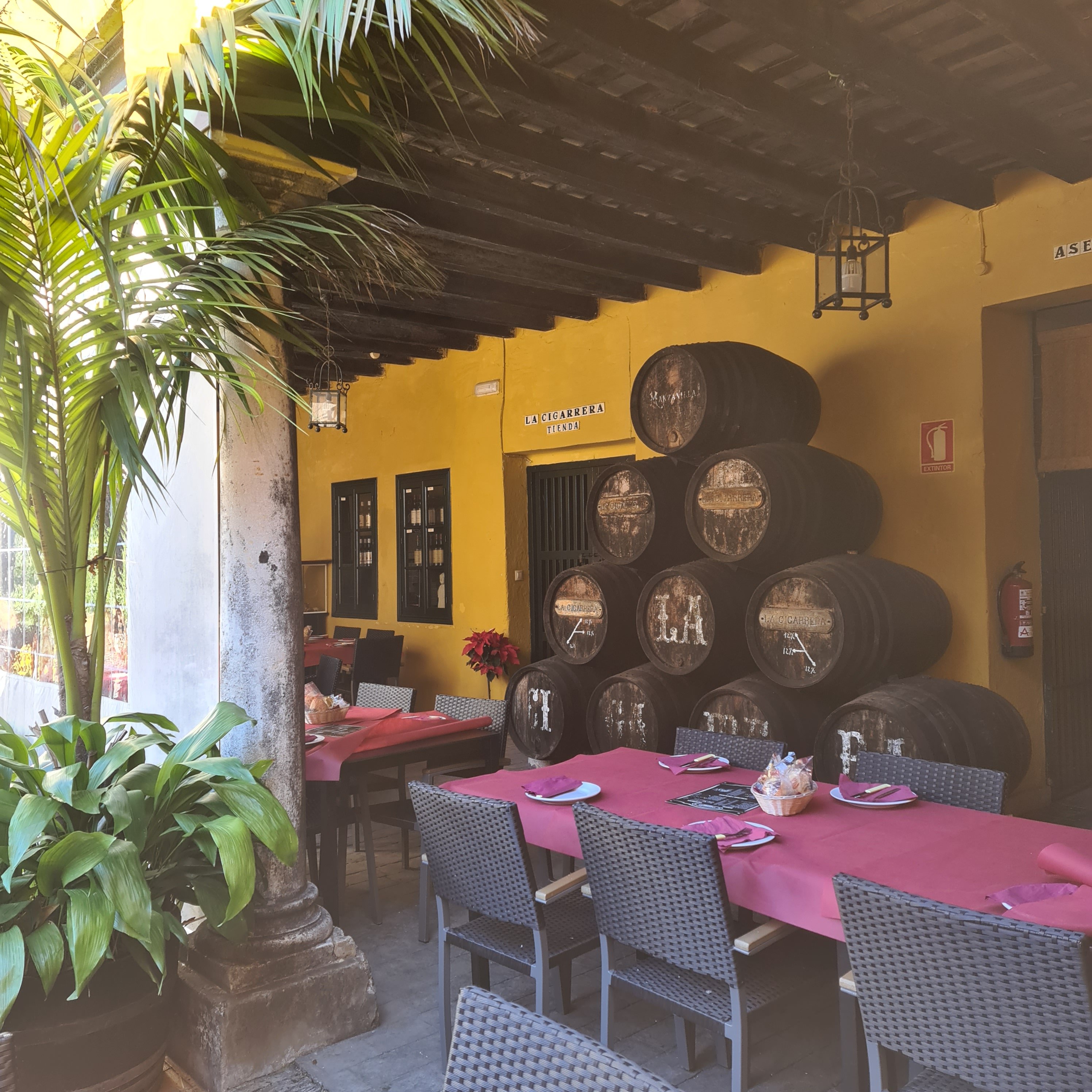 Atravesando una bonita bodega, llegas a una terraza fantástica donde a primera hora del almuerzo da el sol