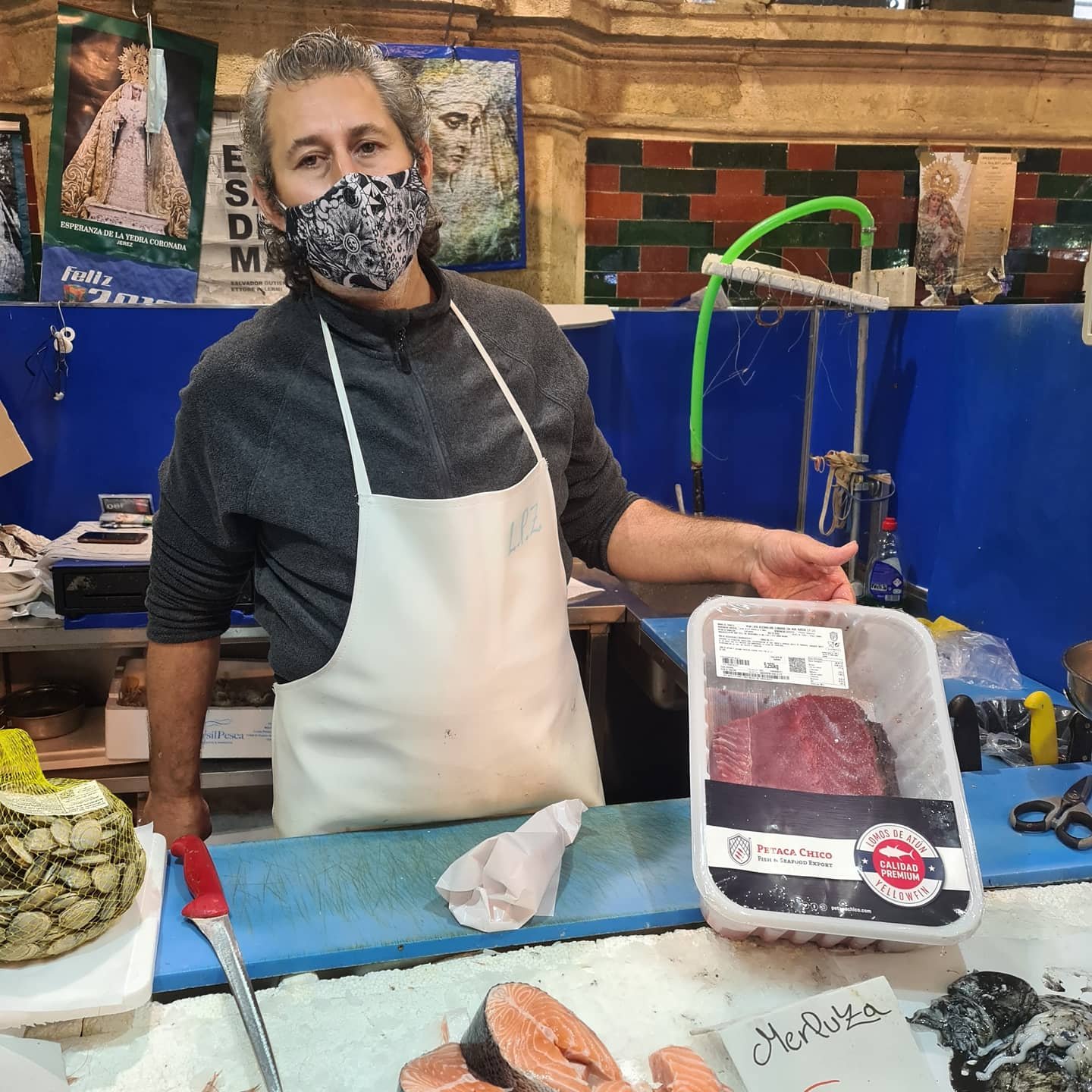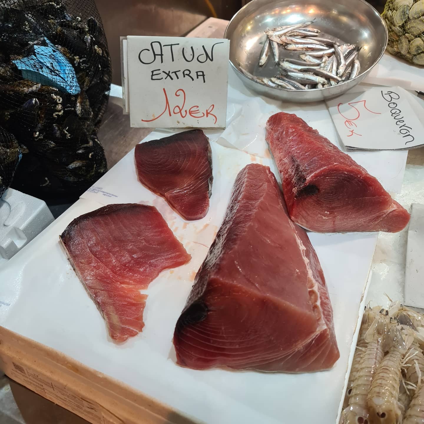 Muy bien asesorada por la gente del lugar, me decanté por el número 16, por el puesto de Juanma. Y como soy una preguntona, Juanma amablemente me enseñó de donde venían esos maravillosos lomos que me iba a llevar a casa, de @petacachico . Pintaza!