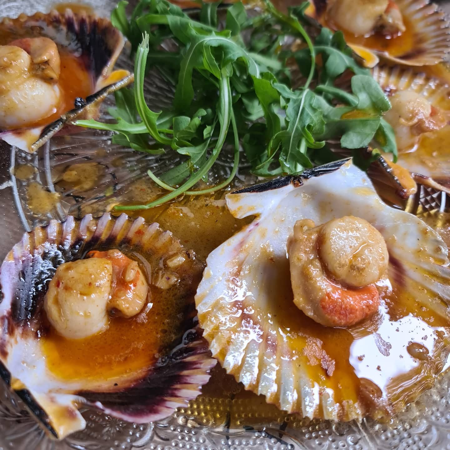 A destacar las zamburiñas con curry rojo y la lubina en tempura. Vino de @bodegasemiliomoro Finca Resalso