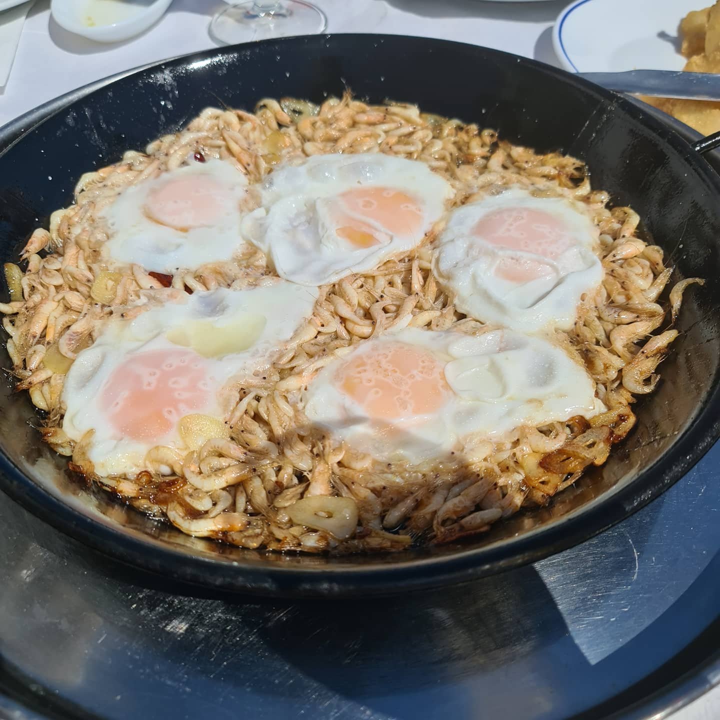 Foto de ella estupenda, y yo como puedo.. jejjee.. y uno de los platos típicos de la venta: camarones al ajillo con huevo!!