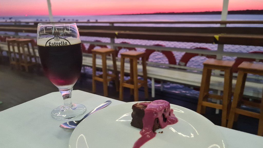 Y para terminar, en la caída del sol, el cielo se unió a la cata, mezclando sus colores con la salsa de frutos rojos que adornaba el brownie, refrescado por una cerveza con cuerpo como 1906 Black Coupage.