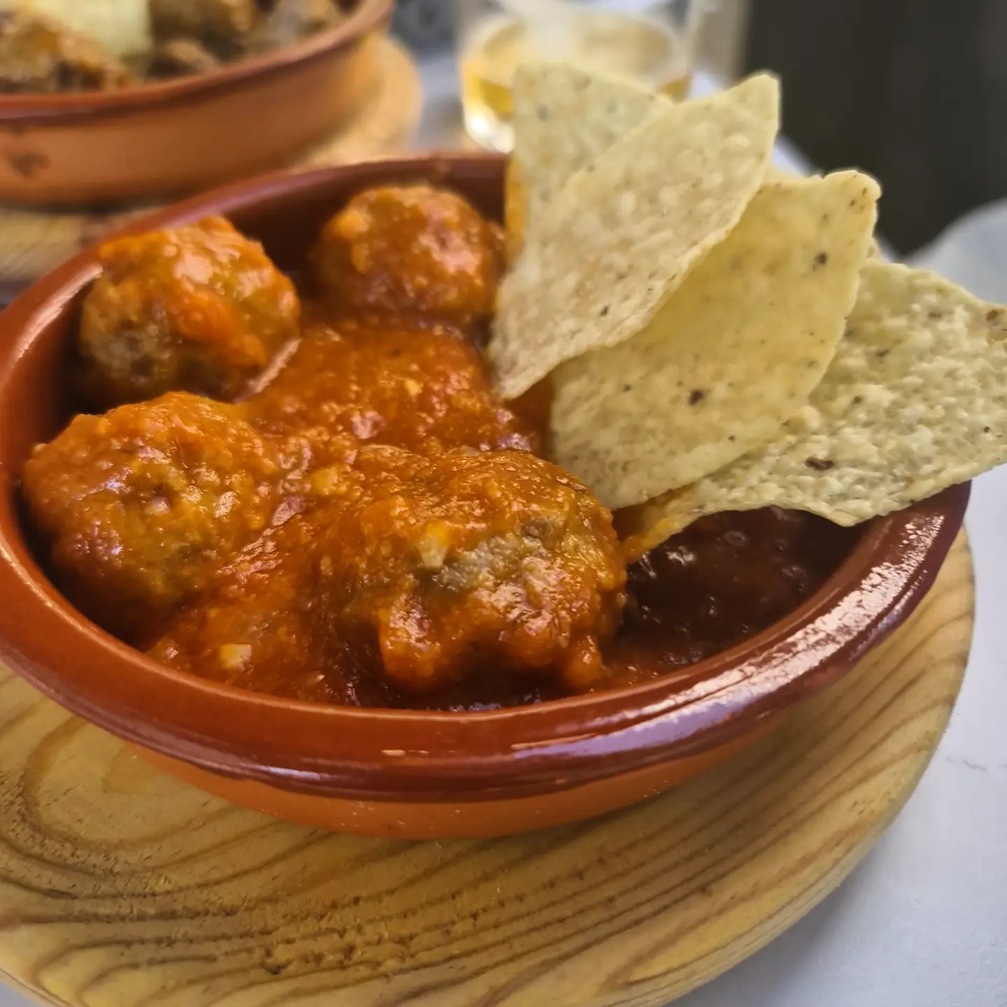 Chicharrones impresionantes y su tapa ganadora del premio de la ruta de la tapa «Fino Perdido» fantástica: mollejas de cerdo ibérico en salsa de oloroso con torta de aceite y ralladura de lima. Mi debilidad: las albóndigas con tomate 👌