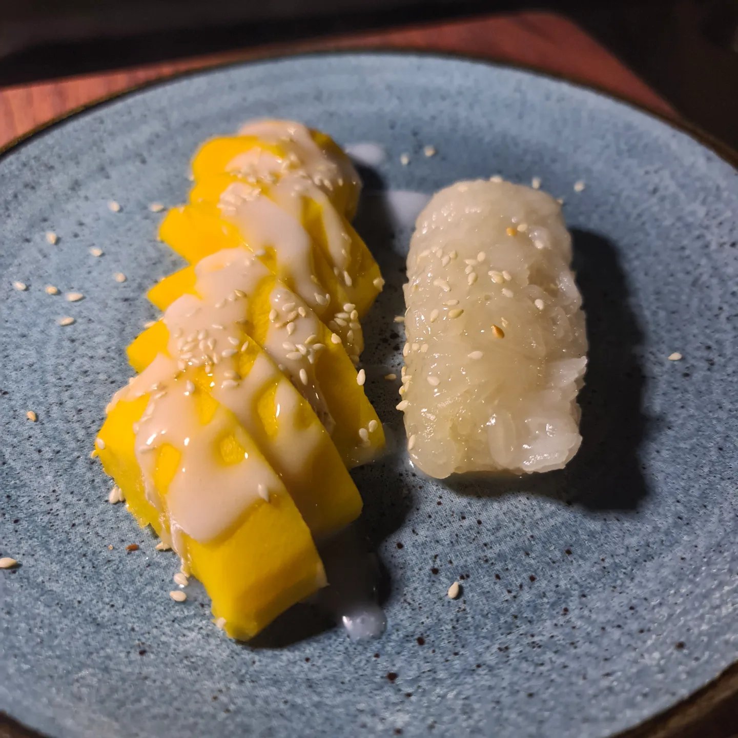De postre Khao Niao Mamuang: un mango 🥭 muy dulce y sabroso, con arroz glutinoso. La combinación muy curiosa!