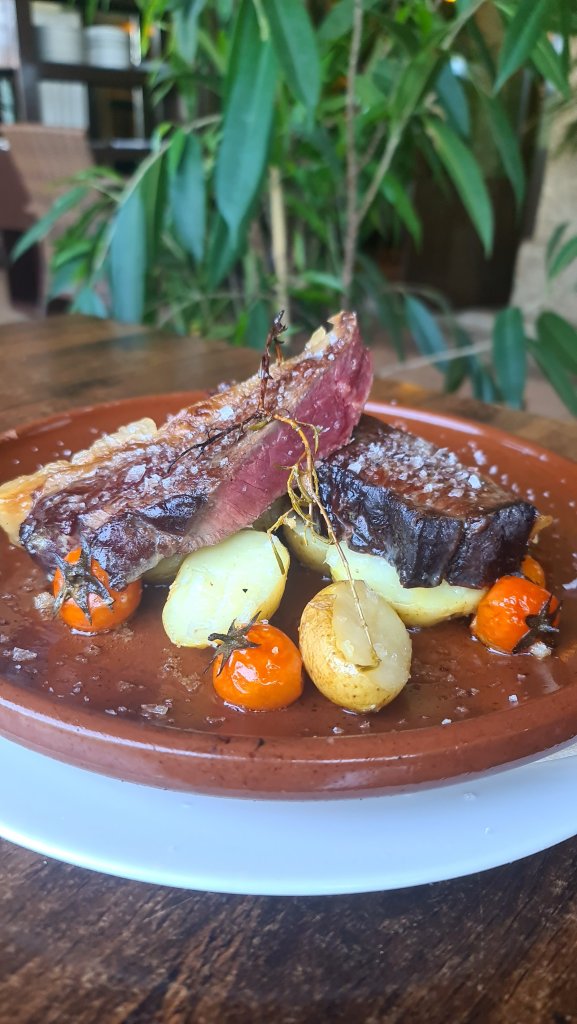 Mención especial al tartar de aguacate con Costillas de atún confitadas encima. Y como amante de lo fresquito en estos días ☀️ y seguir en la misma línea 😆 pedimos el tartar de atún (buenísimo) y un gazpacho de melón (muy original). No podíamos dejar de probar su famosa carne, también retinto, cuyo cocinero está especializado en la selección de las mejores piezas 🥩