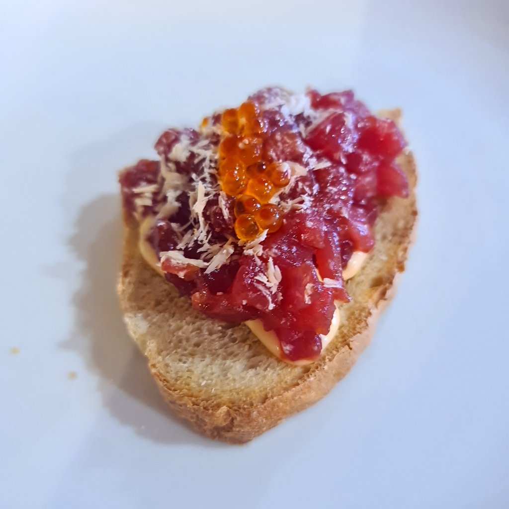 También probamos la tosta con atún y su toque de foie: equilibrado y con una base de pan lo justo de fina para dar protagonismo al atún y comerlo sin problemas. Las huevas cuando explotan en la boca, le da un punto divertido y de sabor extra.