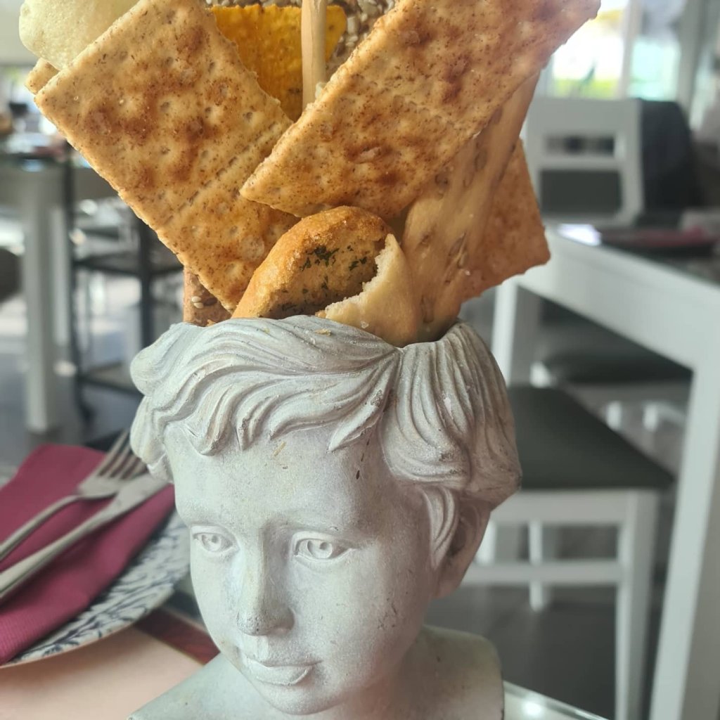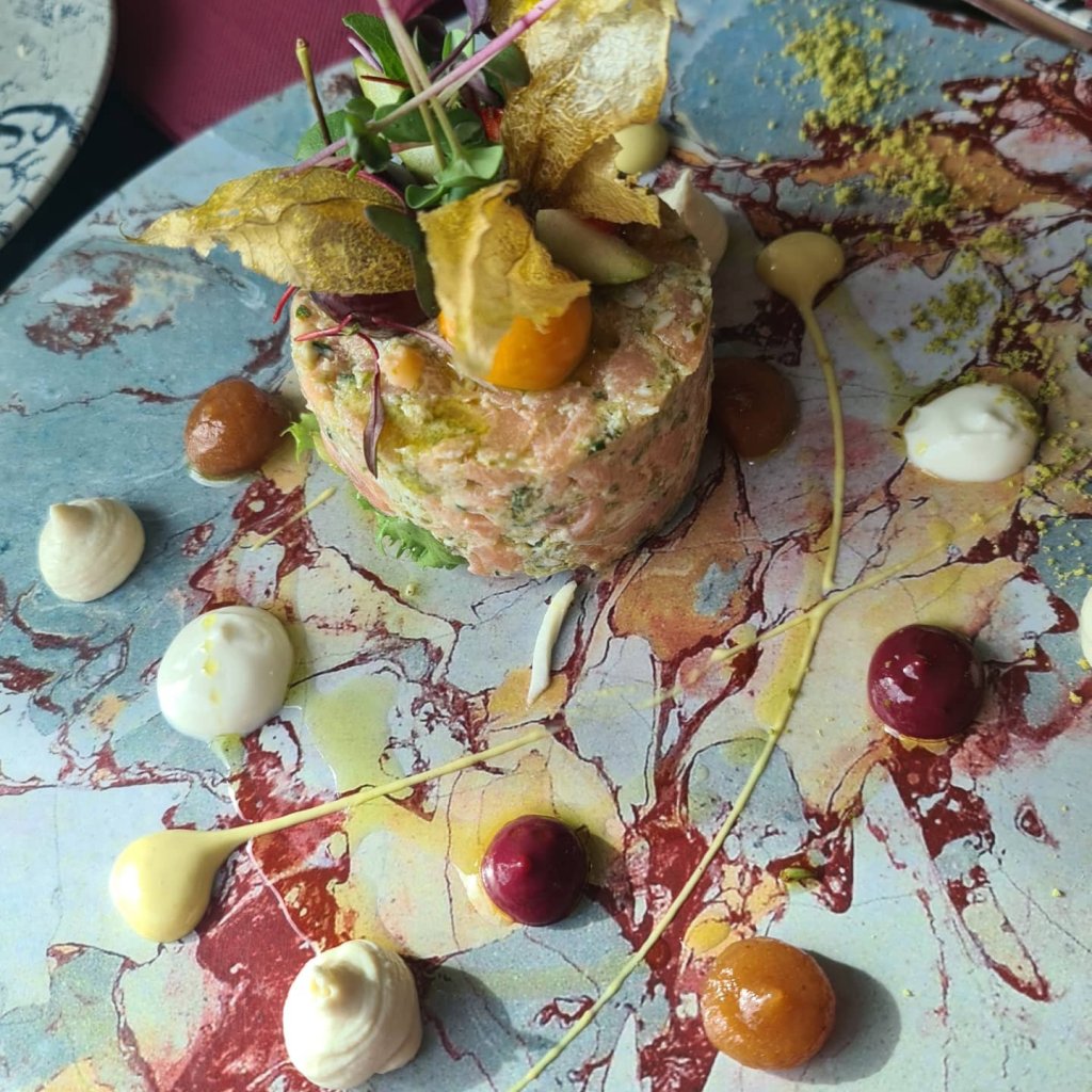 Los hermanos: Jesús y Gonzalo, juegan con los colores, sabores, texturas.. y hasta con los recipientes. Lo mismo te sirven un tartar cde salmón con una cabeza llena de diferentes panes para «dippear», como puedes ver un pavo real encima de una mesa.