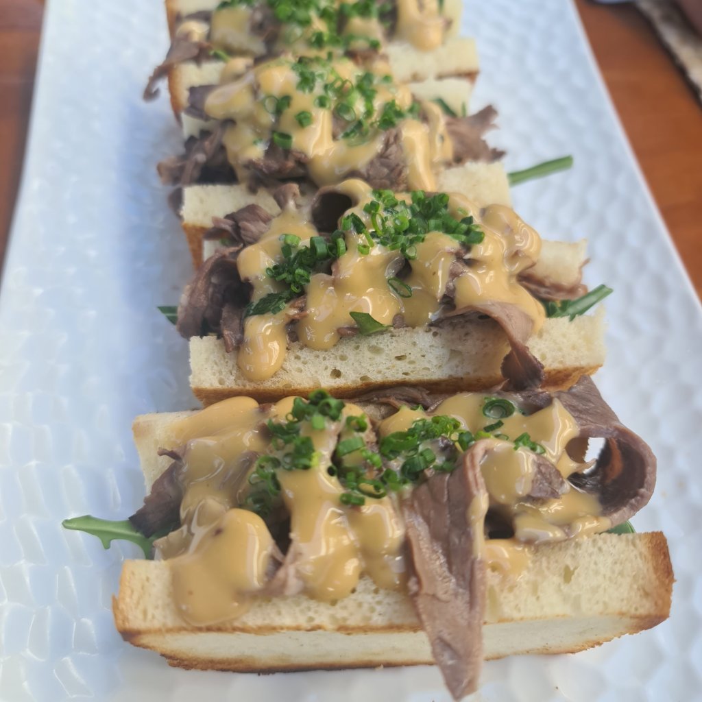 (brioche de mantequilla tostado, compota de cebolla al moscatel y mayo de ajo asado)